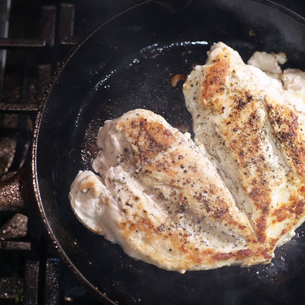 Pre heat oven 400°F. Using a mallet tenderise chicken breast. Then add salt and pepper. In a skillet that is oven safe add the chicken breast to a the skillet at medium heat. Cook 3-4 minutes each side. Once on Ed browned on each side put the skillet in the oven for 7-8 minutes or until the internal temperature of the chicken is 165°F.